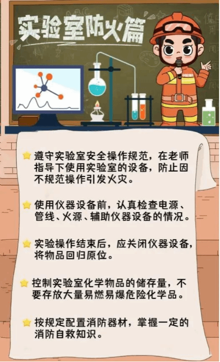 3.消防设施:熟悉实验室所在楼层的消防器材(灭火器、灭火毯、消防沙等)位置及使用方法。严禁遮挡、挪用消防设施。一旦发生火情,保持冷静,按“报警—灭火—疏散”程序处置。